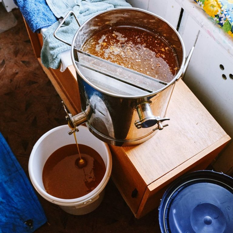 Die Honigproduktion beginnt mit den Bienen, die Nektar von Blumen sammeln. Dieser Nektar wird in den Bienenstöcken von anderen Bienen verarbeitet, verdampft und schließlich zu Honig umgewandelt, der dann geerntet und abgefüllt wird.